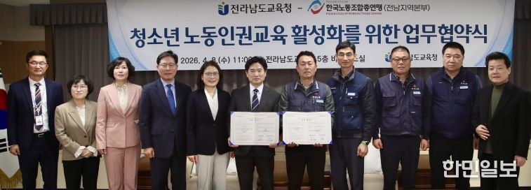 한민일보 서울포커스 임경복 기자 | 전라남도교육청은 4월 8일 청사 5층 비즈니스실에서 한국노동조합총연맹 전남본부와 ‘청소년 노동인권 보호·증진’을 위한 업무협약을 체결했다.