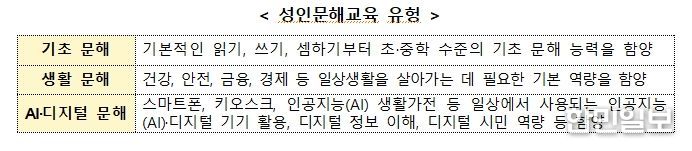 성인 문해교육 지원사업은 배움의 기회를 놓친 어르신 등에게 읽기·쓰기·셈하기 등 기초 문해 역량부터 건강, 안전, 금융 등 일상생활에 필요한 역량, 나아가 인공지능(AI)·디지털 활용 역량까지 함양할 수 있도록 지원하는 사업이다.