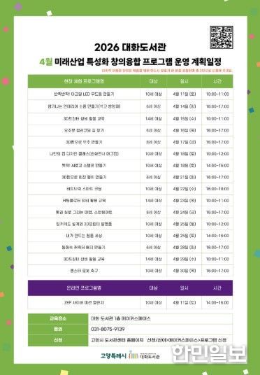 한민일보 서울포커스 김은금 기자 | 고양특례시 대화도서관이 4월 11일부터 30일까지 ‘미래산업 특성화 창의융합 프로그램’을 운영한다고 9일 밝혔다.