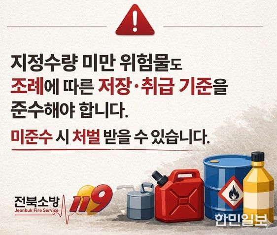한민일보 서울포커스 최성훈 기자 | 전북특별자치도소방본부는 급속한 연소 확대로 인명 피해가 우려되는 위험물 사고를 예방하고자 도민들의 안전 의식을 높이고 소량 위험물 관리 사각지대를 해소하기 위해 안전관리 기준 준수를 강력히 당부하고 나섰다.