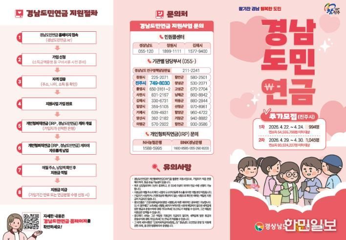 한민일보 서울포커스 김은금 기자 | 진주시는 지난 1월 ‘경남도민연금’ 모집 당시 접수 2일 만에 모집 인원 1001명이 조기 마감되는 등 시민들의 높은 정책 수요와 지속적인 추가 모집 요청을 적극 반영해 오는 22일부터 2039명 규모의 추가 모집을 시행한다고 밝혔다.