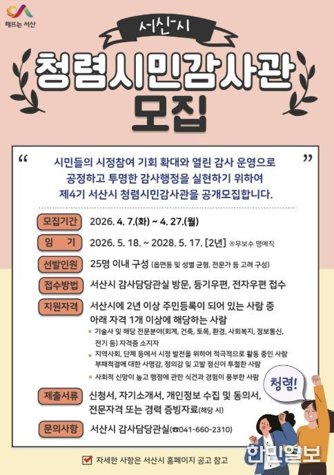 한민일보 서울포커스 임경복 기자 | 충남 서산시가 공정하고 투명한 감사행정 실현과 시민의 시정 참여 기회를 확대하기 위해 제4기 청렴시민감사관을 공개 모집한다고 밝혔다.