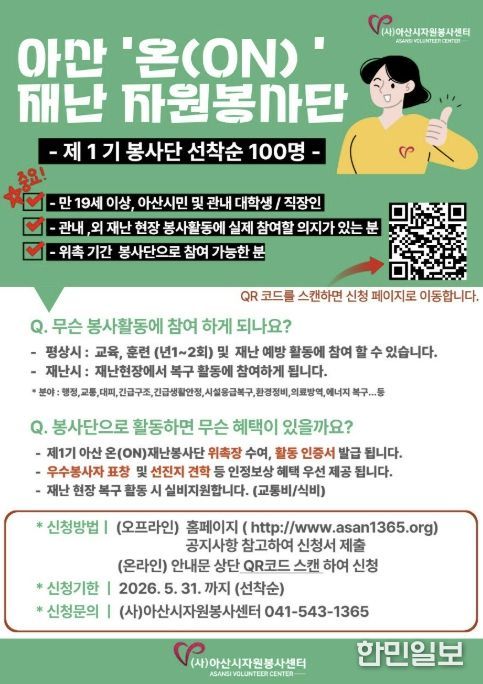 한민일보 서울포커스 임경복 기자 | 아산시는 5월 31일까지 ‘제1기 아산 온(ON) 재난봉사단’에 참여할 자원봉사자 100명을 모집한다고 밝혔다.