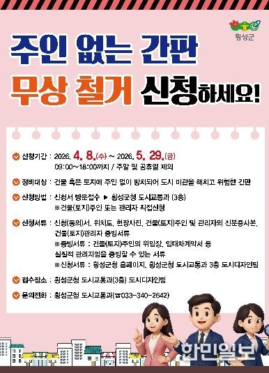 한민일보 서울포커스 진광성 기자 | 횡성군이 건물이나 토지에 주인 없이 방치된 간판의 무상 철거를 지원하는 '2026년 주인 없는 간판 정비사업'을 추진한다고 10일 밝혔다.
