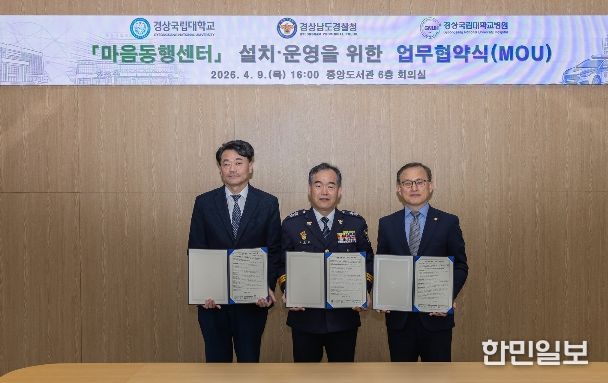 한민일보 서울포커스 박근원 기자 | 경상국립대학교, 경남경찰청, 경상국립대학교병원이 국가 치안을 책임지는 경찰관들의 정신 회복과 마음건강 증진을 위해 힘을 모으기로 했다. 세 기관은 4월 9일 오후 4시 경상국립대학교 가좌캠퍼스 중앙도서관 6층 회의실에서 ‘마음동행센터’ 신설 및 운영을 위한 업무협약을 체결했다.