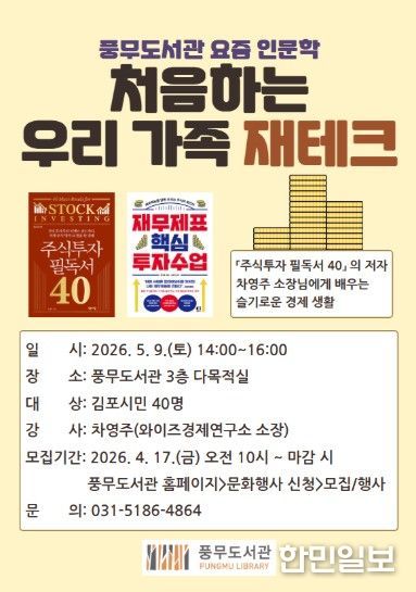 한민일보 서울포커스 임경복 기자 | 김포시 풍무도서관은 김포시민을 대상으로 ‘처음하는 우리 가족 재테크’를 오는 5월 9일 오후 2시부터 4시까지 운영한다.