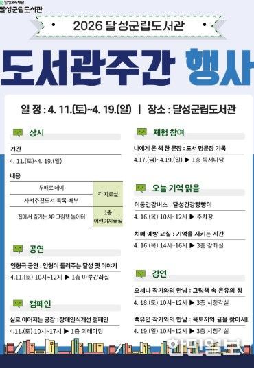 한민일보 서울포커스 임경복 기자 | 대구 달성군립도서관이 ‘2026년 도서관 주간’을 맞아 오는 11일부터 19일까지 주민들을 위한 다채로운 독서 문화 행사를 개최한다.