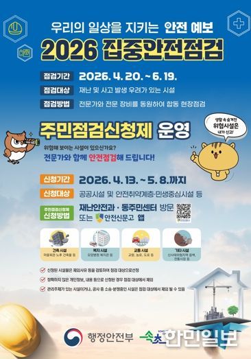 한민일보 서울포커스 임경복 기자 | 속초시는 2026년 집중안전점검 기간을 맞아 4월 13일부터 5월 8일까지 주민점검 신청제를 운영하며 신청을 받는다.