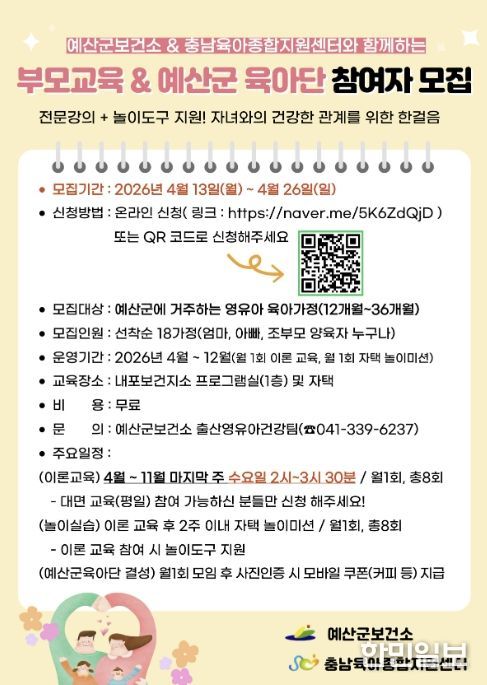 교육은 내포보건지소와 자택을 병행해 진행되며, 부모 역할과 양육 기법을 배우는 이론교육과 부모·자녀가 함께하는 놀이 활동, 부모 간 정보 교류를 위한 육아 네트워크 형성 프로그램 등으로 구성됐다.
