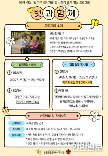 한민일보 서울포커스 진광성 기자 | 영월군종합사회복지관은 관내 65세 이상 1인 가구 어르신을 대상으로 정서 지원과 교류 확대를 위한 프로그램 ‘벗과 함께’ 참여자를 모집한다.
