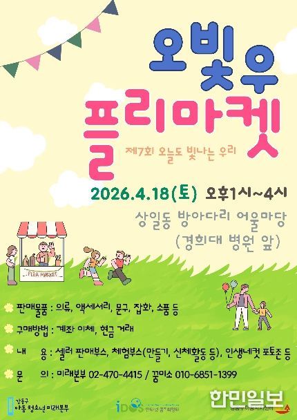 올해로 7회째를 맞는 이 축제는 강동구의 아이들이 직접 기획하는 행사로, 매년 다양한 체험 활동을 통해 아이들에게 큰 호응을 얻어왔다. 올해는 '플리 마켓'을 주제로 오후 1시부터 4시까지 진행되며, 아이들이 직접 만든 물품이나 중고물품을 11개 부스에서 판매한다. 수익금은 판매에 참여한 아이들이 직접 갖도록 해 경제관념을 키울 수 있는 기회도 함께 마련했다.