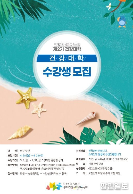 한민일보 서울포커스 기자 | 무거건강생활지원센터는 지역주민의 건강증진을 위한 ‘2026년 제2기 건강대학’ 수강생을 오는 20일부터 22일까지 모집한다고 14일 밝혔다.