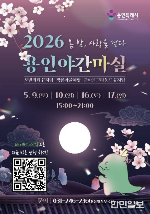 한민일보 서울포커스 김성윤 기자 | 용인특례시는 5월 14일까지 용인의 아름다운 야경을 즐길 수 있는 체험형 관광 프로그램 ‘2026 용인 야간 마실’ 참가자를 모집한다고 15일 밝혔다.