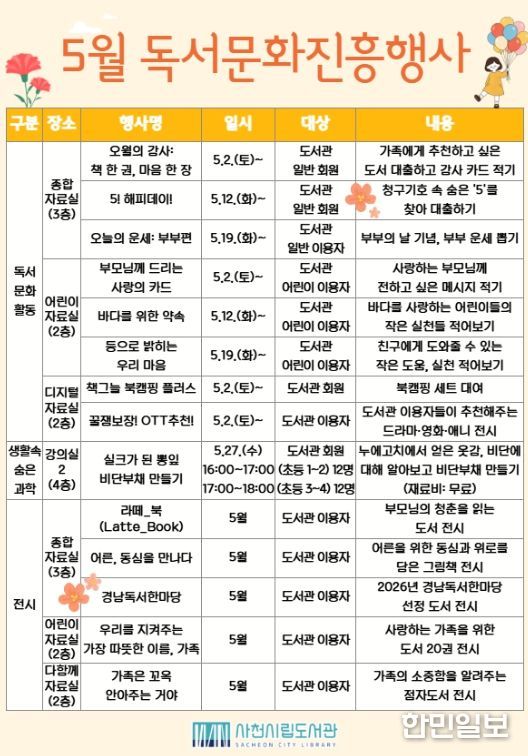 한민일보 서울포커스 김은금 기자 | 사천시립도서관은 가정의 달을 맞아 가족의 의미를 되새기고 시민들의 자발적인 독서 참여를 유도하기 위한 ‘5월 독서문화진흥행사’를 운영한다.