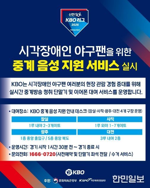 한민일보 서울포커스 최성훈 기자 | KBO는 2023년부터 잠실, 사직, 광주 구장에서 운영해 온 ‘KBO 리그 시각장애인 현장 관람객 대상 중계 음성 지원 서비스’를 올해 대전 한화생명 볼파크까지 확대해 총 4개 구장에서 운영한다.