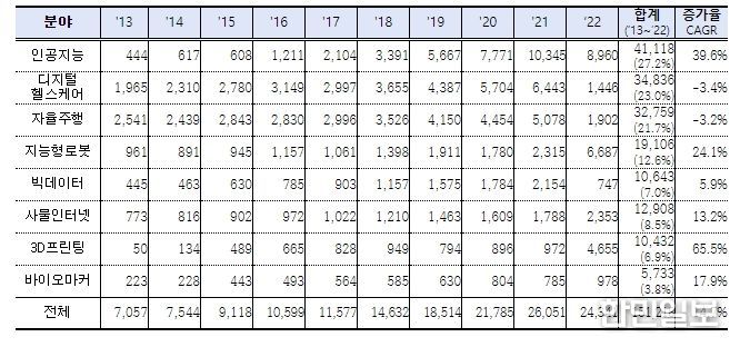 세부 기술 분야로서는 ‘인공지능’ 분야가 가장 높은(27.2%) 비율을 차지했으며, ‘디지털 건강관리’(23.0%)와 ‘자율주행’(21.7%) 분야가 뒤를 이었다. 특히 인공지능 분야의 ’13년도 출원은 444건으로 8대 주요 기술 중 6번째에 불과했으나 ’16년 이후 급격히 증가해 ’22년에는 8,960건으로 1위를 차지했다. ’16년은 알파고의 등장으로 인공지능 시대의 도래를 대중에게 알린 해이기도 하다.