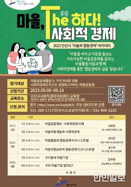 한민일보 서울포커스 윤민경 기자 | 안산시는 이달 15일부터 26일까지 안산시 사회적경제지원센터 교육실에서 ‘마을, The(더) 하다! 사회적경제 아카데미’를 운영한다고 12일 밝혔다.