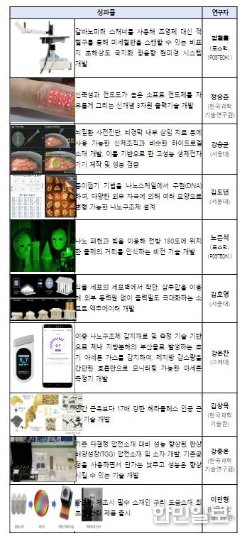 총 10개의 주요 나노, 소재 그리고 기술의 융합으로 달성한 연구성과를 확인할 수 있다.