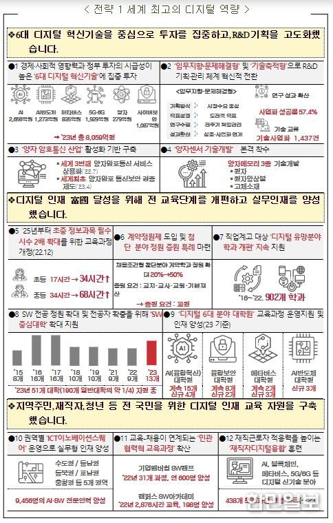 '대한민국 디지털 전략' 발표 이후 1년 간 23개 정부기관은 101개 정책과제를 본격적으로 추진했다. 특히, ▲안전한 데이터 거래환경 조성을 위한 ‘데이터 자산 부정사용 방지 및 개인정보 전송요구권 제도화’, ▲디지털 교육 혁신을 위해 ‘25년부터 정보과목 필수시수를 2배로 확대하는 교육과정 개정’, ▲‘디지털플랫폼정부 본격 가동을 위한 기반 마련’ 등 제도 정비를 통한 정책 기반 조성에 집중했다. 또한, 혁신적 제도 정비를 바탕으로 마련한 데이터 가치평가, 민간투자형 공공 SW사업, 갈등해결형 실증특례 제도 등에서 제1호 성공사례들을 창출했다.