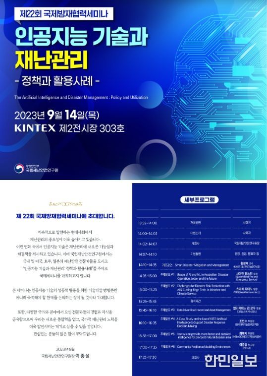 '2023년 대한민국 안전산업박람회(9.13.~15.)'와 연계하여 개최되는 올해 국제방재협력 세미나는 ‘인공지능(AI) 기술과 재난관리’를 주제로 국내·외 전문가가 한자리에 모여, 재난관리 분야에서 인공지능 기술을 성공적으로 활용하는 방안을 모색하고자 마련됐다.