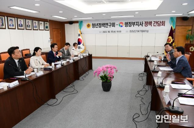 한민일보 서울포커스 임호근 기자 | 경상남도의회 의원 연구단체인 ‘청년정책연구회’(회장 정재욱 의원, 이하 “연구회”)는 10월 17일 도의회 의정회의실에서 경남도 최만림 행정부지사, 강석 도민소통특별보좌관과 함께 청년정책 발굴을 위한 간담회를 가졌다.