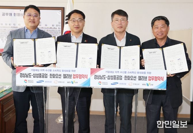한민일보 서울포커스 임호근 기자 | 경상남도는 2일 행정부지사 집무실에서 최만림 행정부지사, 이상억 삼성중공업 총무그룹장, 박정현 한화오션 지원팀장, 류정무 웰리브 지원본부장 등이 참석한 가운데 기업대상 지역 수산물 소비촉진을 위한 업무협약을 체결했다고 밝혔다.