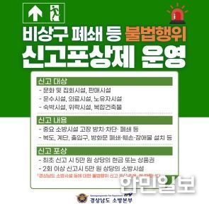 한민일보 서울포커스 임호근 기자 | 경상남도 소방본부는 16일 겨울철 소방안전대책과 관련해 비상구 폐쇄 등 불법행위 신고포상제에 대한 도민의 관심을 촉구했다.