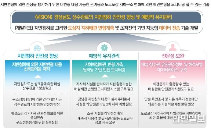 도는 경상남도 재난안전연구센터, 부산대학교(지진방재연구센터), 기업체와 함께 민관이 협업하여 ‘지반침하 및 지하배관 파손 예측 기술 개발’ 과제를 발굴했다.