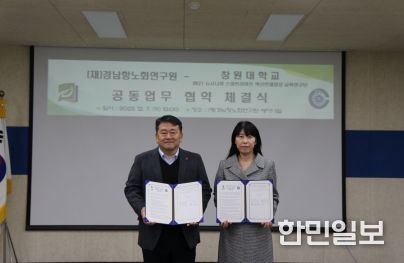 한민일보 서울포커스 임호근 기자 | 재단법인 경남항노화연구원은 7일 연구원 세미나실에서 창원대학교 BK21 뉴시니어 스마트라이프 혁신인재양성 교육연구단과 양 기관 상호 교류․협력을 통해 학․연 공동발전을 도모하고 고령화사회 대비 지역인재 양성을 위한 공동 업무협약을 체결했다고 밝혔다.