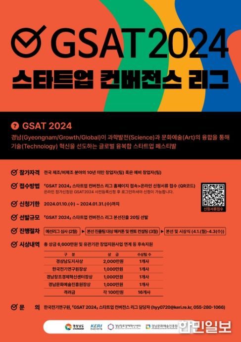 한민일보 서울포커스 임호근 기자 | 경남도는 지역 창업생태계 활성화를 위한 창업 경연대회인 ‘GSAT 2024 스타트업 컨버전스 리그’에 참여할 창업기업을 10일부터 31일까지 모집한다고 밝혔다.