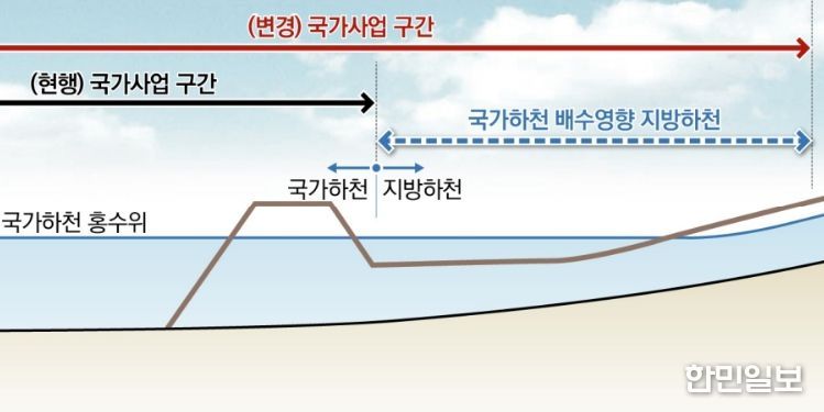 개정된 하천법에는 집중 호우로 인한 지방하천의 범람 위험과 수해를 줄이기 위해 환경부 장관이 국가하천 배수영향 구간을 고시하고, 하천공사에 관한 비용은 국고의 부담으로 한다는 원칙을 담고 있다.