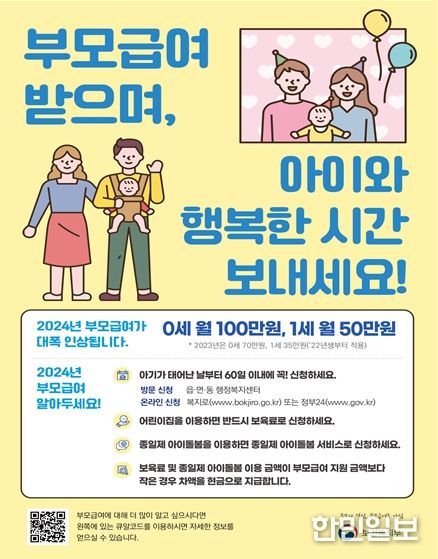올해부터 0⁓1세 영아를 양육하는 부모에게 지급하는 부모 급여를 0세는 월 70만 원에서 100만 원, 1세는 월 35만 원에서 50만 원으로 각 월 30만 원, 15만 원을 인상하여 확대 지원한다.