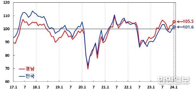 (소비자동향) 24일 한국은행이 발표한 ‘2024년 1월 경남지역 소비자 동향조사 결과‘에 따르면, 1월 경남지역 소비자심리지수(CCSI)는 105.5로 전월(102.7)보다 2.8p 상승했으며, 3개월 연속 오름세이다.