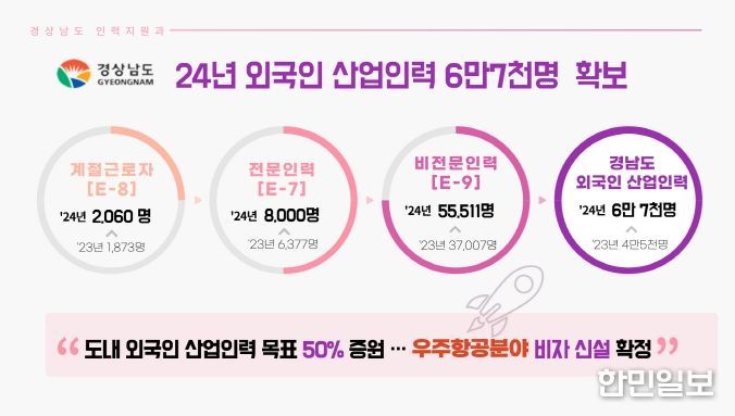 한민일보 서울포커스 임호근 기자 | 경상남도는 일자리 부족을 해소하기 위해 올해 도내 외국인 산업인력 목표를 6만 7천명으로 세우고, 지역경제 활성화에 앞장설 계획이다.