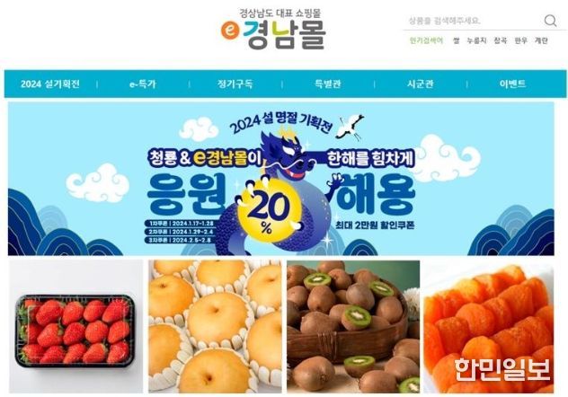 한민일보 서울포커스 임호근 기자 | 경남도는 민족 고유의 명절 설을 맞아 도민의 장바구니 물가 부담을 줄이고, 소상공인 온라인 판로를 지원하기 위해 2월 8일까지 e경남몰에서 설맞이 할인 기획전을 실시하고 있다.