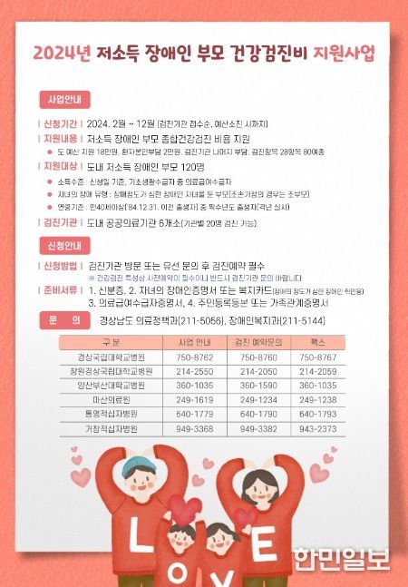 한민일보 서울포커스 임호근 기자 | 경남도는 장애 자녀를 돌보는 취약계층 부모에게 건강검진 기회를 제공하는 ‘저소득 장애인부모 건강검진비 지원사업’을 시행한다고 밝혔다.