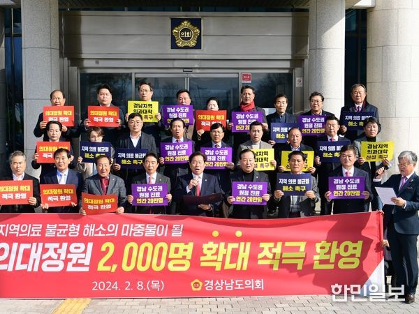한민일보 서울포커스 임호근 기자 | 경상남도의회 김진부 의장을 비롯한 의원 일동은 2월 8일 도의회 현관 앞에서 지난 6일 보건복지부의 ‘2025학년도 의과대학 정원 2,000명 확대’ 발표와 관련해 적극 환영의 뜻을 전하고 의대 정원 확대만으로는 해소할 수 없는 지역 내 의료인력 불균형 문제 해결을 위해 조속히 경남지역 내 의과대학을 신설해 줄 것을 정부에 촉구하는 성명서를 발표했다.