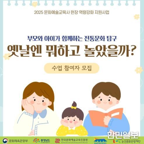 한민일보 서울포커스 유돈상 기자 | (재)논산문화관광재단이 오는 8월 23일부터 10월 25일까지 유아 가족을 대상으로 하는 문화예술교육 프로그램 ‘옛날엔 뭐하고 놀았을까?’를 운영한다.
