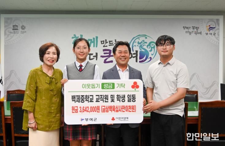 이에 박정현 부여군수는 “백제중학교 학생들과 교직원들의 이웃사랑과 따뜻한 마음에 깊이 감사드리며, 이러한 마음이 지역사회에 큰 힘이 되어 어려운 이웃들에게 큰 희망이 될 것이다.”라며 감사의 마음을 전했다.