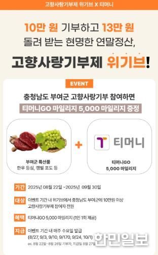 한민일보 서울포커스 유돈상 기자 | 부여군은 모빌리티 플랫폼 티머니(Tmoney)GO와 고향사랑기부제 민간 플랫폼 위기브(wegive)가 함께 8월 22일부터 9월 30일까지 특별 제휴 이벤트를 진행한다고 밝혔다.