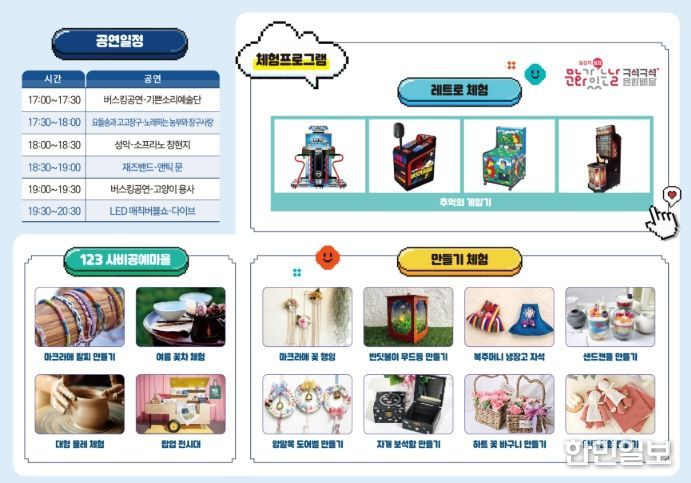‘레트로 체험’ 코너에서는 ▲추억의 게임기 체험이 준비되어 있고, ‘123 사비공예마을’과 ‘만들기 체험’ 부스에서는 ▲마크라메 팔찌 만들기 ▲여름 꽃차 체험 ▲대형 물레 체험 ▲마크라메 꽃 행잉(벽걸이) ▲반딧불이 무드등 만들기 ▲복주머니 냉장고 자석 ▲샌드캔들 만들기 ▲자개 보석함 만들기 ▲하트 꽃바구니 만들기 ▲행주 인형 만들기 등 가족 단위 방문객이 즐길 수 있는 다양한 체험이 준비되어 있다.