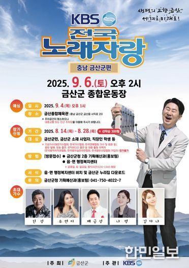한민일보 서울포커스 유돈상 기자 | 금산군은 9월 6일 오후 2시 금산군종합운동장에서 KBS한국방송공사가 주관하는 ‘KBS전국노래자랑’ 본선 무대가 개최된다고 밝혔다.