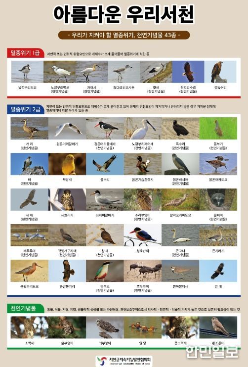 한민일보 서울포커스 진광성 기자 | 서천군지속가능발전협의회기후생태환경분과위원회는 서천군 관내에서 서식하는 천연기념물 및 멸종위기종 43종과 산새 96종을 정리한 “우리가 지켜야 할 멸종위기, 천연기념물 43종”과 “늘 우리곁에 함께하는 산새 96종”을 제작해 관내에 있는 32개 학교와 교육청, 유관기관에 배포했다고 알려왔다.