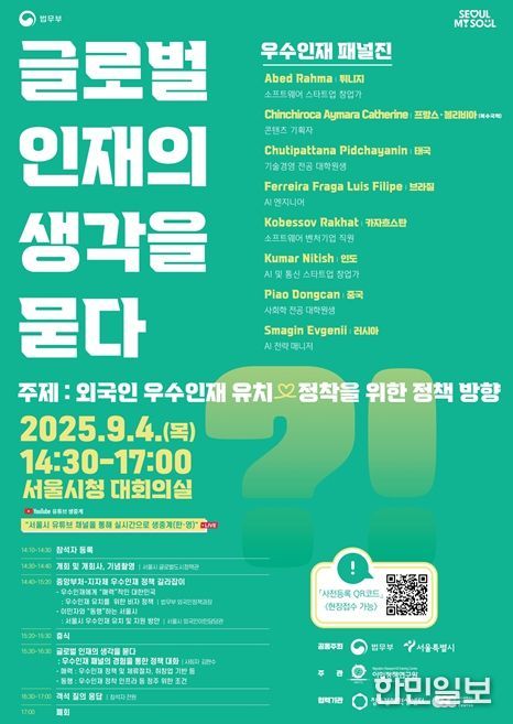 한민일보 서울포커스 국용호 기자 | 서울시와 법무부는 4일 14시 30분 서울시청 대회의실에서 첨단산업 우수인재 유치 및 정착을 위한 '‘글로벌 인재의 생각을 묻다.’ 라운드테이블'을 공동 개최한다.