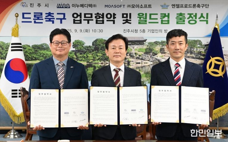 한민일보 서울포커스 최성훈 기자 | 진주시는 9일 오전 10시30분 시청 5층 기업인의 방에서 이누메디텍㈜, 엔젤드론축구단과 함께 드론축구 활성화를 위한 3자 업무협약(MOU)를 체결하고 ‘2025 전주 드론축구 월드컵’에 참가하는 엔젤드론축구단의 출정식을 가졌다.
