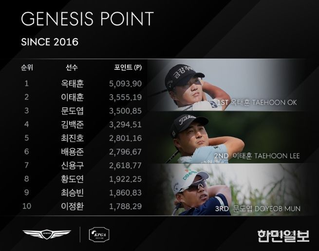 옥태훈은 ‘제68회 KPGA 선수권대회 with A-ONE CC’ 우승 이후 제네시스 포인트 1위로 올라선 뒤 ‘KPGA 군산CC 오픈’, ‘동아회원권그룹 오픈’, ‘KPGA 파운더스컵’까지 4개 대회 연속 제네시스 포인트 1위 자리를 지켜내고 있다.