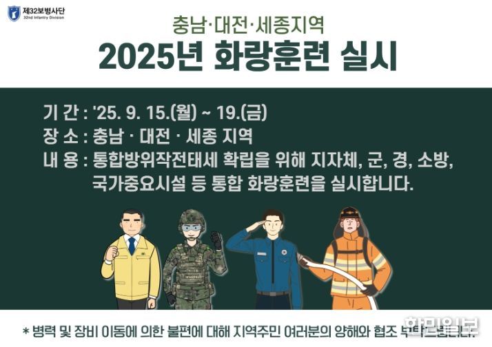 한민일보 서울포커스 유돈상 기자 | 육군 제32보병사단은, 오는 9월 15일부터 9월 19일까지 충남ㆍ대전ㆍ세종 지역에서 화랑훈련을 한다고 밝혔다.