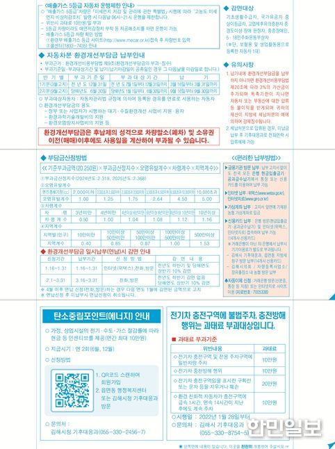 김해시 관계자는 “환경개선부담금은 후납제 방식으로 부과되기 때문에 소유권 변경이나 폐차, 말소 이후에도 1~2회 더 부과될 수 있다”며 “기한 내 납부하지 않아 불이익을 받지 않도록 기간 내 납부를 당부드린다”고 말했다.