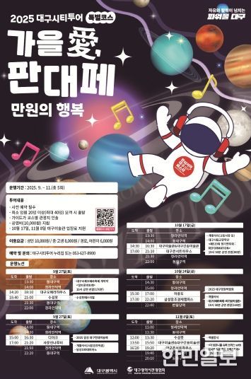 한민일보 서울포커스 유한희 기자 | 대구광역시는 가을 정취를 만끽할 수 있는 대구 대표 축제 ‘판타지아대구페스타’와 연계한 시티투어 특별노선 ‘가을 愛, 판대페 만원의 행복’을 9월 27일부터 11월 8일까지 총 5회에 걸쳐 운영한다.
