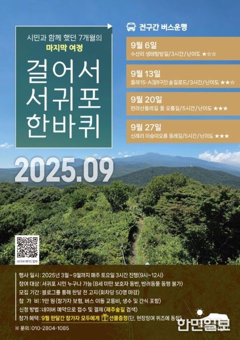 한민일보 서울포커스 김다남 기자 | 서귀포시는 건강한 걷기문화 확산과 시민 건강증진을 위해 운영 중인 ‘걸어서 서귀포 한바퀴’ 프로그램이 오는 9월 27일 마지막 일정을 앞두고, 누적 1,000여 명이 참여하며 큰 호응을 얻고 있다고 밝혔다.